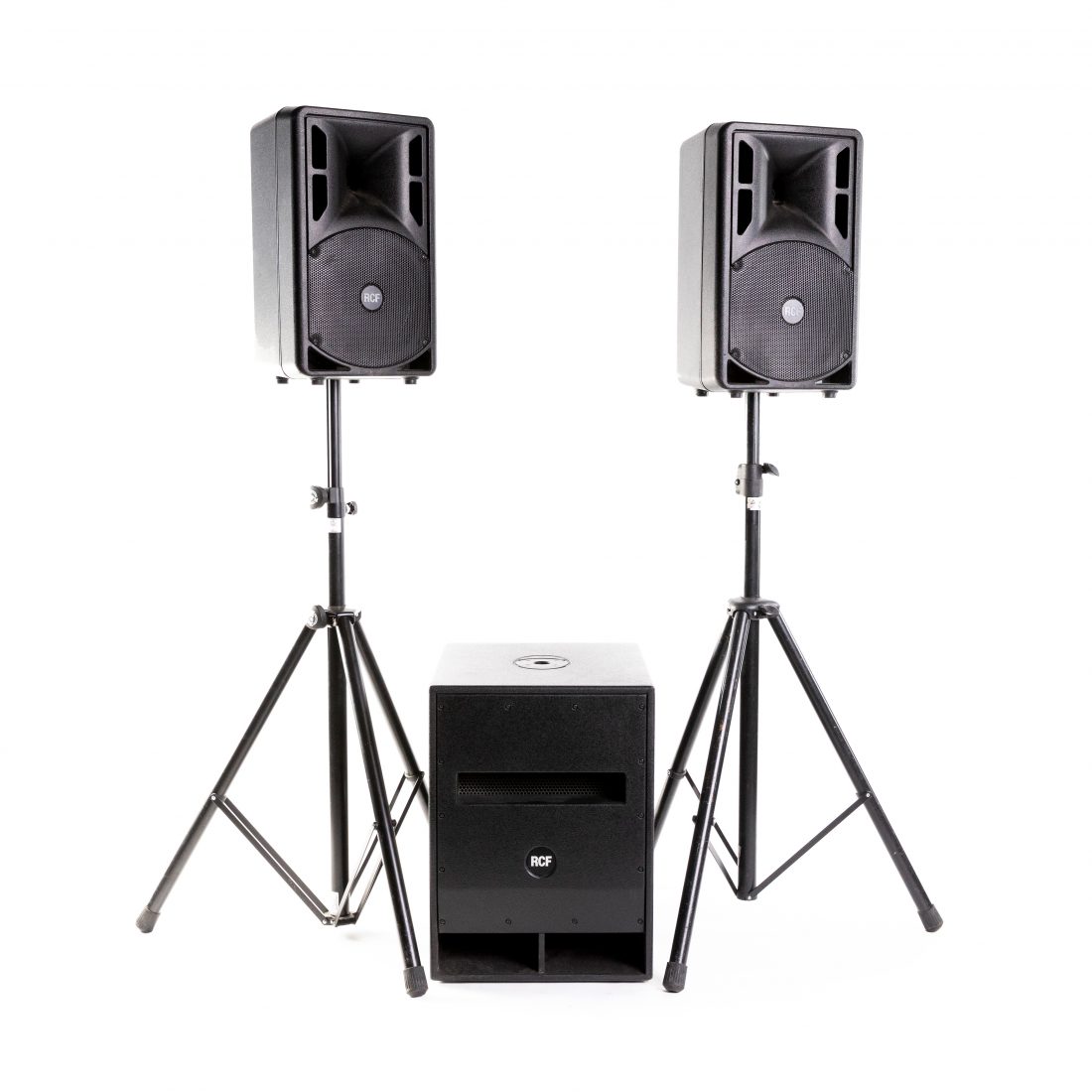 SoundSystem M bestehend aus 2x RCF ART 310 MK III, 2x K&M Lautsprecherstativ, einem RCF SUB 705 und allen Kabeln, um die Anlage an einen Mixer oder ein Mischpult anzuschließen. Für alle, die gerne ein bisschen mehr Bass haben.